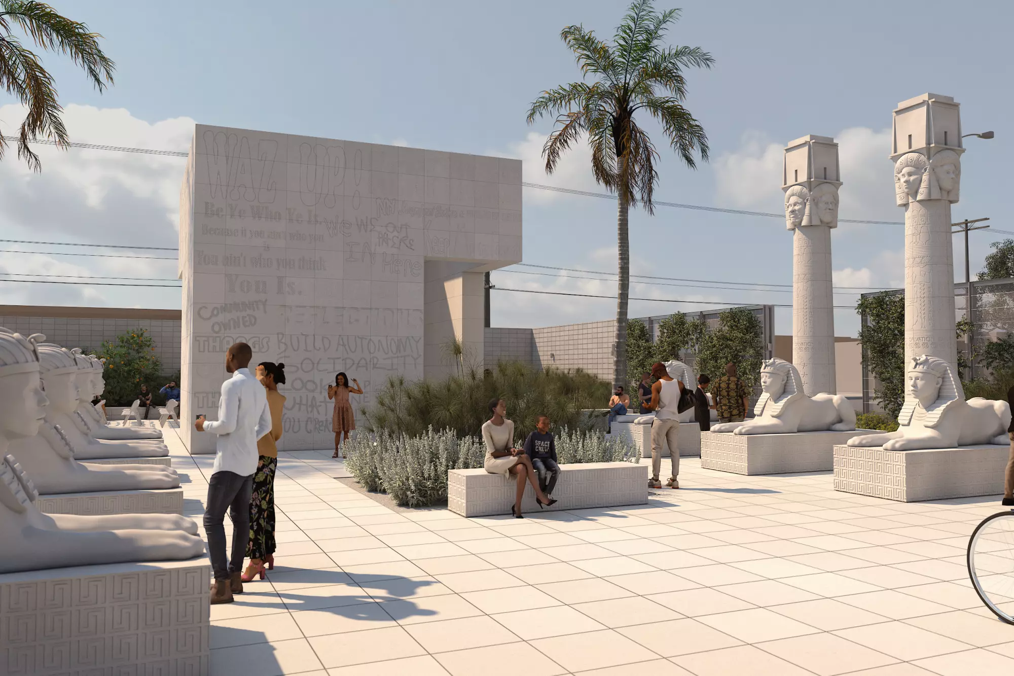 Eight sphinxes and eight Hathoric columns will be carved with images that are meaningful to Halsey, including personal heroes, family, friends, community activists and organizers. Surrounding walls and a cube-like central seating area will be constructed with glass-fiber-reinforced concrete panels, and native plants will ring the project.